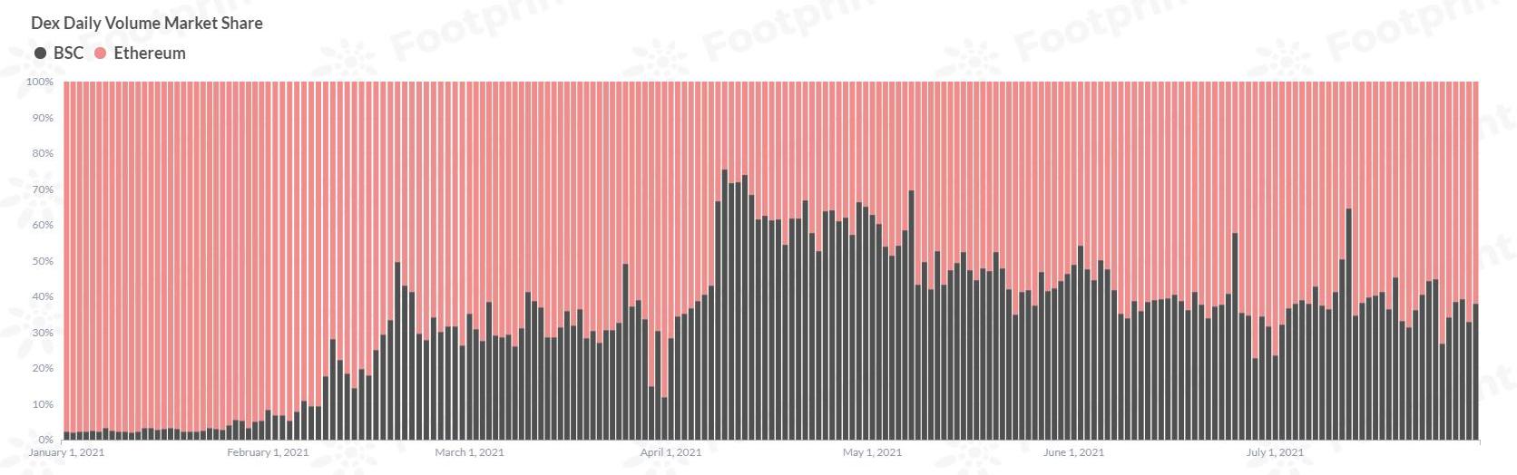 DeFi的高速發展使得以太坊上擁堵的現象更加明顯,隨之高漲的Gas費也被市場進一步放大。此時的幣安智能鏈憑借相對較低的Gas費發力趕超,從Footprint上的統計數據觀察到,在交易量上幣安智能鏈從今年2月開始逐漸上升,在市場份額上二季度甚至一度超過以太坊。