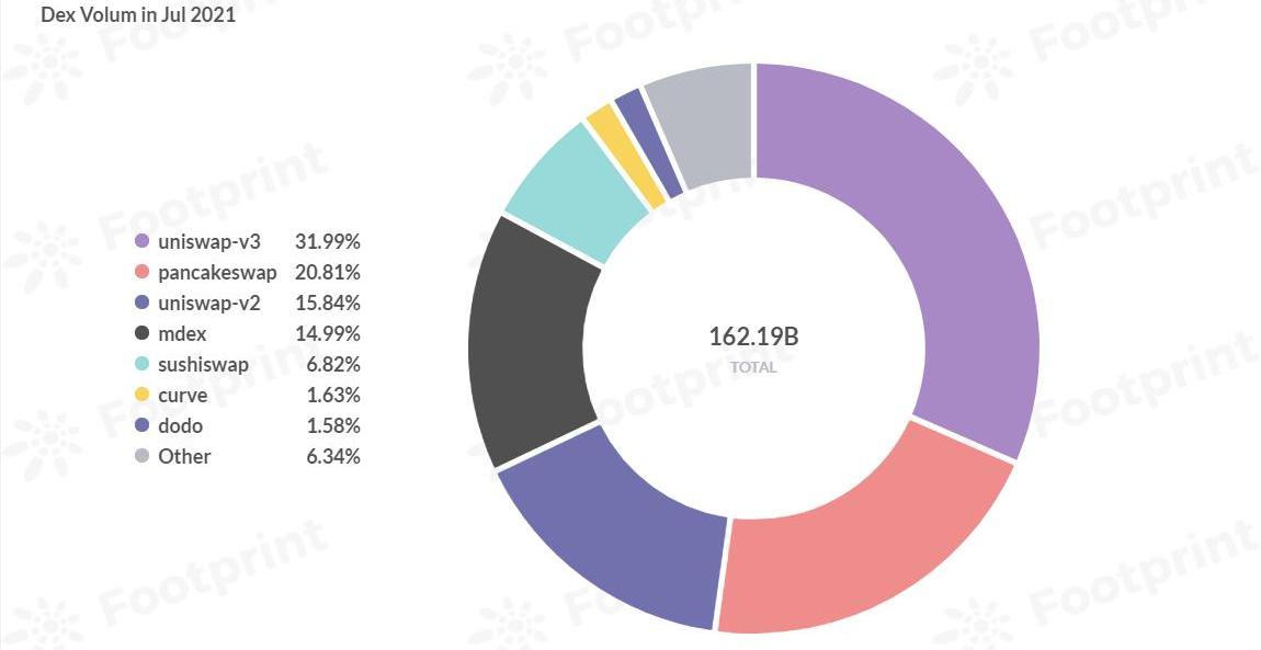 從Footprint上統計出7月整月有發生過交易的交易對個數Sushiswap只有1750個,而?UniswapV2有16534個,UniswapV3有3386個,而PancakeSwap7月的交易對有135278個。