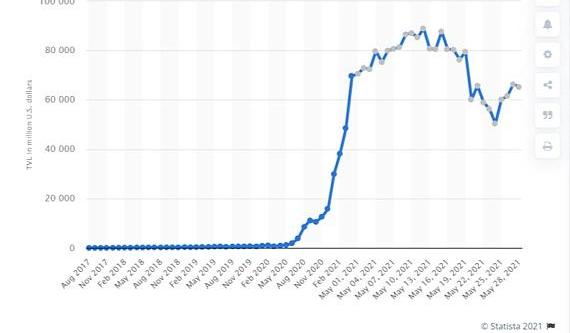 從借貸、保證金交易、支付、到保險等領域,DeFi建立了一個由集成協議和金融工具組成的龐大網絡。Defi從2020年到2021年出現直線拔高,2021年5月12日超過888億美元。但由于近100種加密貨幣的價格波動及以太幣的交易費用的上漲,Defi在五月中旬出現下降趨勢。不難發現,Def市值與以太坊的走向有著出奇的一致。