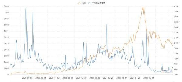 平均單筆手續費反映了每日單筆鏈上轉賬的手續費的平均值。受DeFi推動,ETH平均單筆手續費在2020年9月份達到歷史最高點,突破0.032ETH。2021年以來,平均每筆手續費在較高為震蕩,最高點在2月23日達0.024ETH。6月份以來,該數值在0.003以下浮動,目前以太坊的交易手續費處于低值。