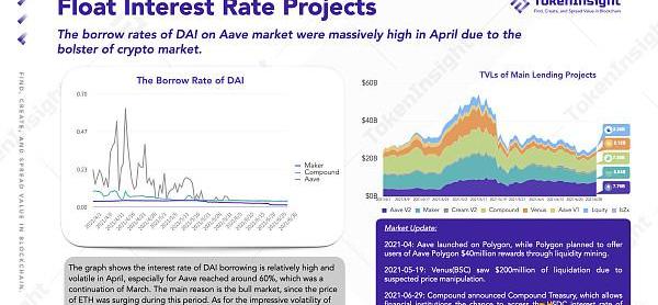 4月中旬?Coinbase?上市的篝火,無差別映紅了每一個參與者的臉龐。體現在DeFi的借貸市場上來看就是,AAVE上的DAI借貸率一度達到60%,并在4月下旬開始逐漸回落。