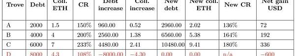 此時TroveD的抵押率為108%觸發清算。由于穩定池LUSD不足,D的抵押品4.3個ETH和8000LUSD債務則會被分配到其他Trove頭上,TroveD的凈損失約7%。在剩余的ABC三個倉位中,抵押率越充足的被分配到的抵押品及LUSD越多。TroveC被分配到最多的抵押品及最多的債務債務,其抵押率由233%降低至180%,其凈收益為$336。