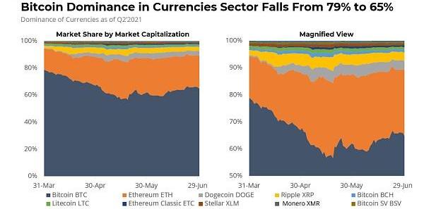 以太坊的市場份額(基于市值)仍然僅次于比特幣,但正在上升,而DOGE、ETC和XRP在加密領域的市場份額仍然很小。今年二季度,比特幣在加密領域的市場份額主導地位從79%下降到65%,見下圖: