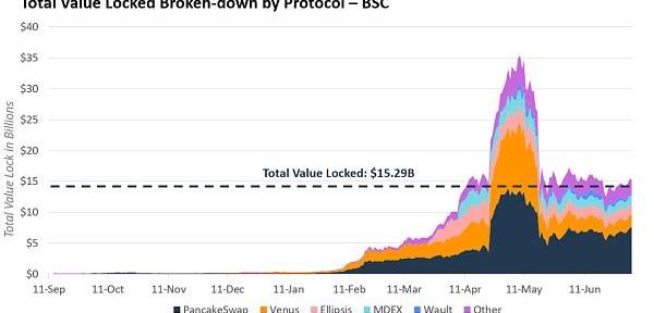 上圖:2020年9月以來,BSC鏈上的各個主要協議的TVL變化情況(單位:10億美元)。截止今年7月5日,BSC上的TVL總價值回落到了約150億美元。
