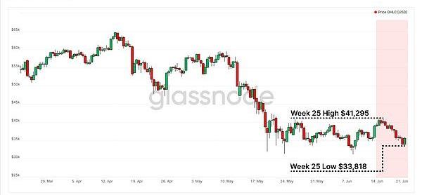 本周,比特幣的市場在價格上和鏈上活動方面表現相對疲軟。價格在最近的盤整范圍內交易,從周初的高點41,295美元,下降到周末的低點33,818美元。