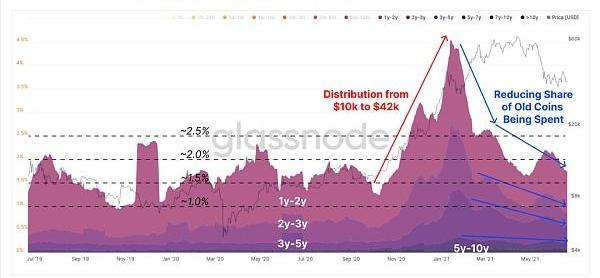 如果我們調查過去一年的總花費行為,我們看到年輕的代幣在交易流量中的比例持續增加。在過去的幾個月里,我們看到年輕的代幣占總交易量的45%以上。很可能是新市場進入者的結果: