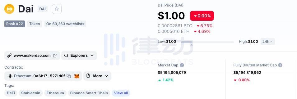 截至今天,DAI的市值超過50億美元,價格穩定在1美元左右。