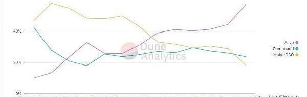 從UniswapV3的迭代,再到CurveV2的迭代看,未來的DEX格局還存在很大的變數。還要考慮到一點,就是DeFi目前還處于非常早期的階段,如逆水行舟,不進則退。我們可以來看看,DeFi上最重要的領域之一借貸市場的情況:去年六月,MakerDAO和Compound的用戶數占據整個DeFi借貸市場的絕大部分,而AAVE僅有10%左右,如今,AAVE用戶數占據市場的57%以上,而MakerDAO和Compound分別下降到19%和24%左右。