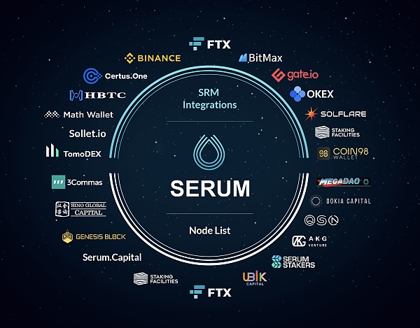 在今年8月30日,作為Solana公鏈的去中心化交易所Serum?DEX的上線備受矚目,而時至今日短短的一個月左右的時間,Serum已經形成了一個十分龐大的生態,并且Serum也一直是行業內的焦點。Serum 項目目前已經得到了 Solana、Kyber、CMS、3Commas 和 Compound 創始人 Robert Leshner 等一票機構和個人的支持,在 Serum 的合作伙伴名單中,我們還可以看到 Multicoin Capital、Robot Ventures、Genesis Block、Sino Global Capital、AKG Venture、CoinGecko、TomoChain、Gauntlet Network、Bcoin、Proof of Capital 等機構。?
