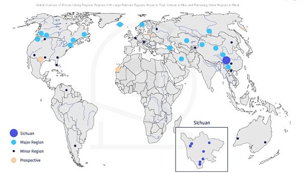 數據顯示,目前全球最重要的采礦中心位于中國的云南、新疆、內蒙古和四川省,其中四川省占全球哈希率的一半以上。其他中心分布在美國、俄羅斯和哈薩克斯坦等。