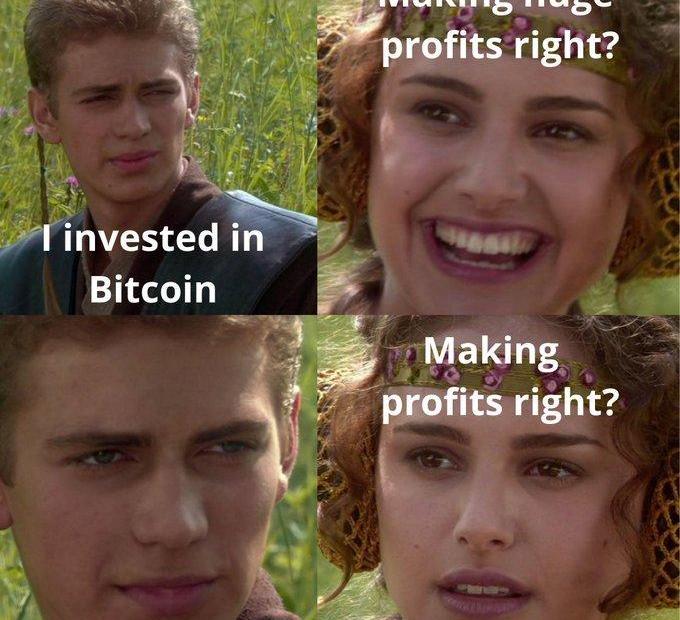 印度加密社區在這次市場暴跌中也貢獻了一些有趣的表情包,比如前端工程師ShubhamKhatri就拿星球大戰的阿納金·天行者一角開涮,如下圖所示,對白: