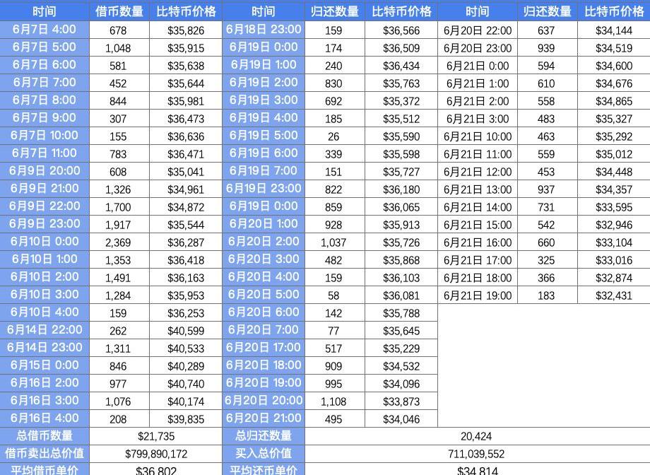 第二次做空,巨鯨前后一共耗時近2周時間,主要借幣時間集中在「6月7日4:00-6月7日12:00」、「6月9日22:00-6月10日5:00」、「6月14日20:00-6月15日1:00」、「6月16日2:00-6月16日5:00」,歸還時間主要集中于「6月18日23:00-6月19日8:00」、「6月19日23:00-6月20日8:00」、「6月20日17:00-6月21日4:00」、「6月21日10:00-6月21日20:00」。