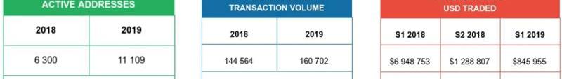 圖中數據是18年和19年間關于NFT產品的每周活躍地址、每周與智能合約的交互量、每周美元交易量。智能合約交互量略有增加,活躍地址大幅上漲,而交易量卻同比18年下降80%以上。