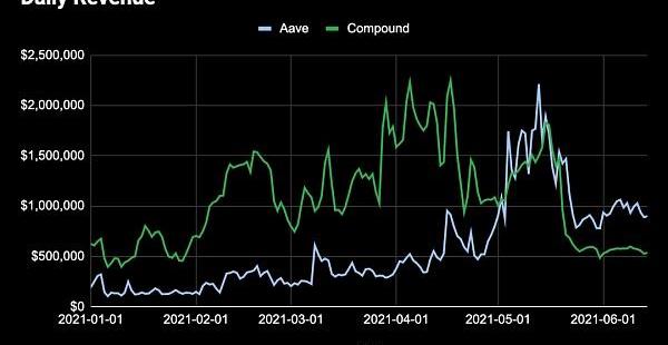 上圖:今年迄今Aave(藍線)和Compound(綠線)的每日收入變化情況。數據來源:TokenTerminal