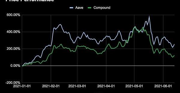 上圖:今年迄今AAVE(藍線)和COMP(綠線)代幣價格的漲幅變化情況。數據來源:TokenTerminal