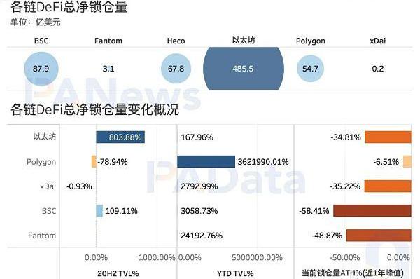 盡管當前以太坊上DeFi的鎖倉量仍然遠遠高于其他鏈,達到了485.5億美元,下一梯隊的BSC、Heco和Polygon分別只有87.9億美元、67.8億美元和54.7億美元,分別僅相當于以太坊DeFi規模的18.11%、13.96%和11.27%。