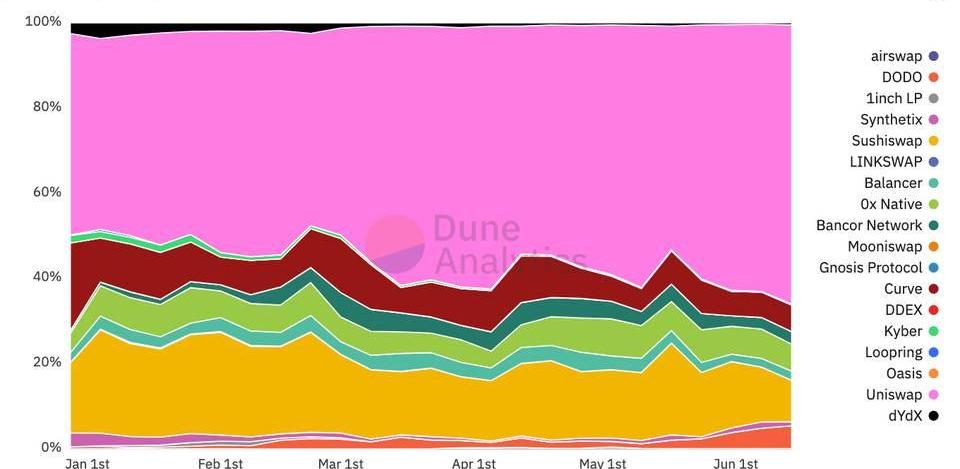 但你猜怎么著?Uniswap仍然是DEX領域的主導力量,沒有其他協議能夠接近其產生的交易量和費用,這從其60%以上的市場占有率以及年初至今三位數的增長率可見一斑。
