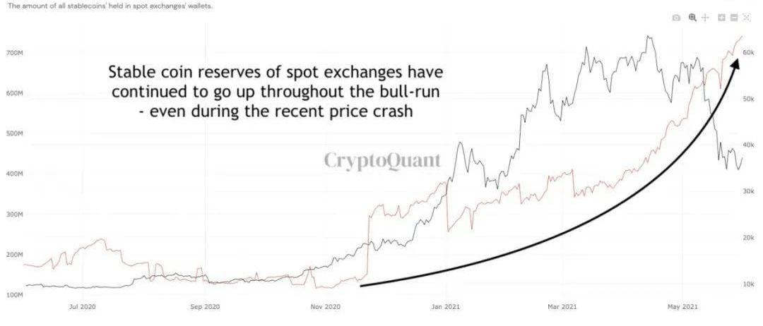 對比特幣敞口持續需求的另一個可能跡象是現貨交易所的穩定幣儲備持續上升。
