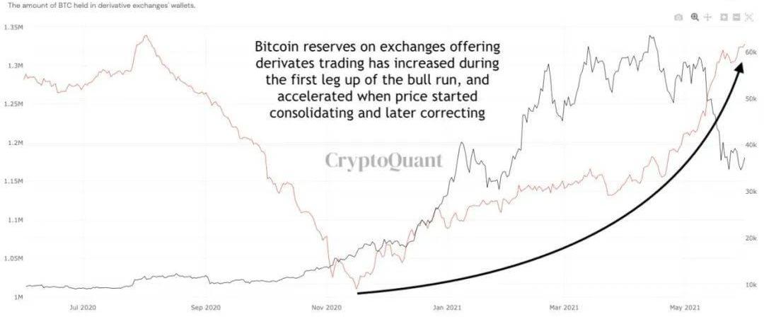 衍生品交易所的比特幣儲備部分是作為高杠桿交易的抵押品。在2021年1月比特幣價格達到頂部之后的幾個月里,比特幣期貨的未平倉頭寸增加了一倍以上,表明市場參與者越來越愿意承擔風險,這可能是市場開始興奮起來的跡象。
