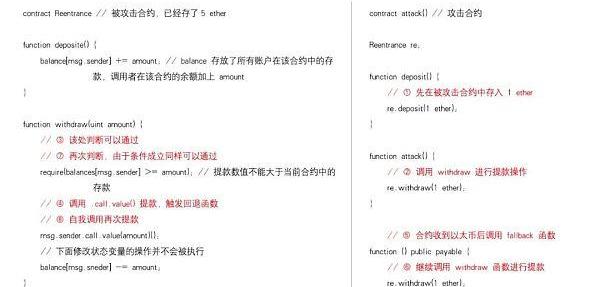 在以太坊中,智能合約能夠調用其他外部合約的代碼,由于智能合約可以調用外部合約或者發送以太幣,這些操作需要合約提交外部的調用,所以這些合約外部的調用就可以被攻擊者利用造成攻擊劫持,使得被攻擊合約在任意位置重新執行,繞過原代碼中的限制條件,從而發生重入攻擊。重入攻擊本質上與編程里的遞歸調用類似,所以當合約將以太幣發送到未知地址時就可能會發生。