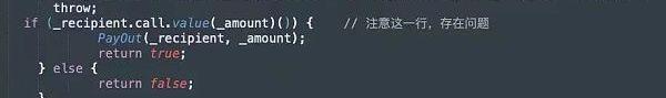 對_recipient發出.call.value調用,轉賬_amount個Wei,.call.value調用默認會使用當前剩余的所有gas。