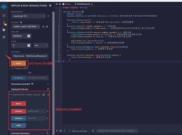 首先使用一個賬戶(0x5B38Da6a701c568545dCfcB03FcB875f56beddC4)扮演受害者,將該合約在RemixIDE?點擊Deploy按鈕進行部署。