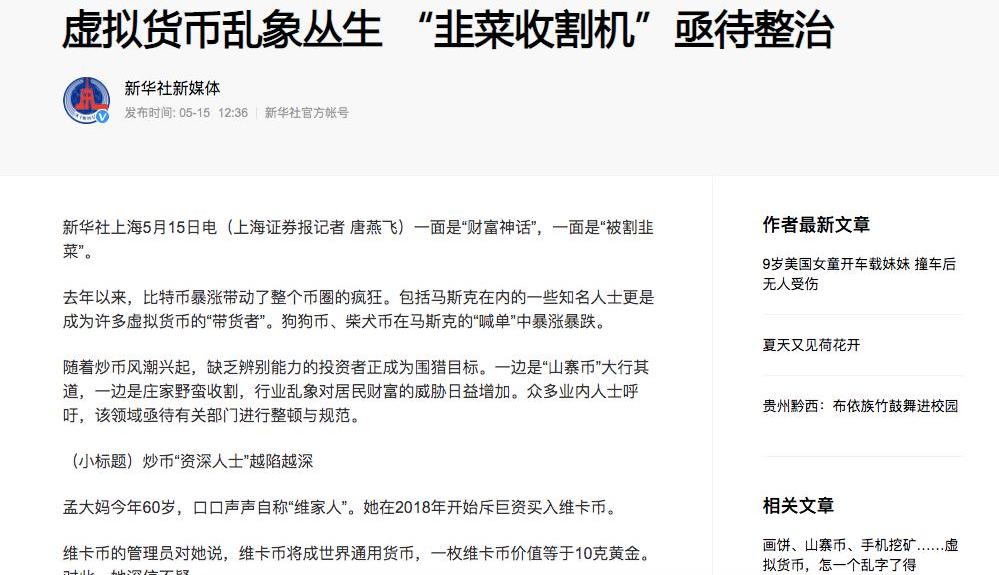 據統計,新華社在近半個月內連發6篇文章,包括《虛擬貨幣亂象叢生,“韭菜收割機”亟待整治》、《警惕炒作空氣幣新型傳銷》、《詐騙、洗錢、價格操縱,虛擬貨幣成了“犯罪新寵”?》、《加密貨幣,是金融創新還是“龐氏騙局”?》、《百倍杠桿!瘋狂的幣圈帶來“暴富”還是“爆倉”?》、《不能讓高耗能“礦場”擠占寶貴資源》,揭露了虛擬貨幣挖礦、交易、融資等多個環節存在的問題。