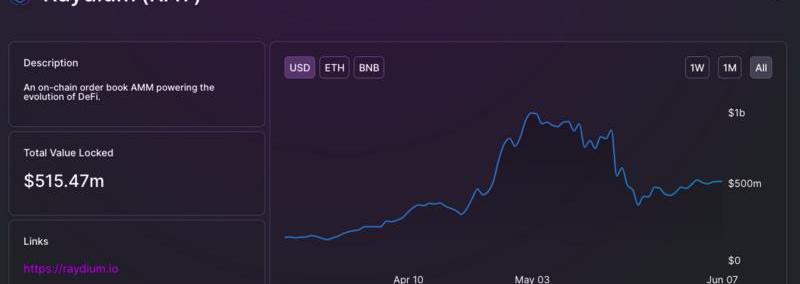 Solana生態內的龍頭DeFi也不難猜——Raydium。DefiLlama數據顯示,Raydium當前的鎖倉量為5.15億美元,雖然也占據了整條Solana生態?TVL的過半比例,但較5月3日的歷史高點9.6億美元已近乎腰斬。