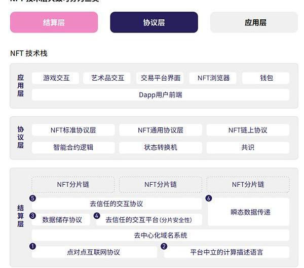 NFT技術層大致可分為三類:結算層、協議層、應用層。