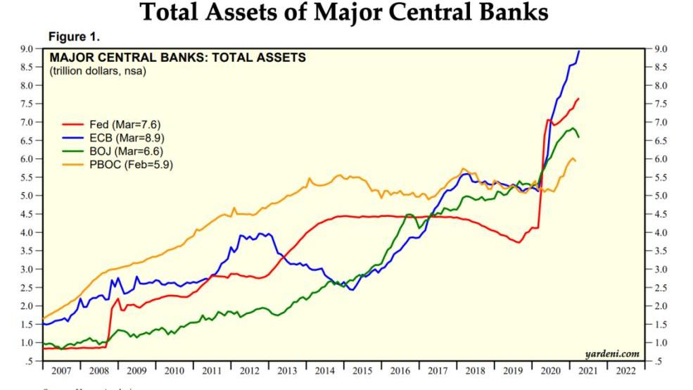 以上的圖表示不僅美聯儲在印鈔,全世界的央行都在印鈔。我們可以看到ECB和BOJ的印鈔能力很強。其中,ECB是今年開始瘋狂的。BOJ的資產負債表規模和歐洲央行和美聯儲差不多,而日本的經濟體量卻無法和它們相比的。所以,BOJ的印鈔規模也比較夸張。