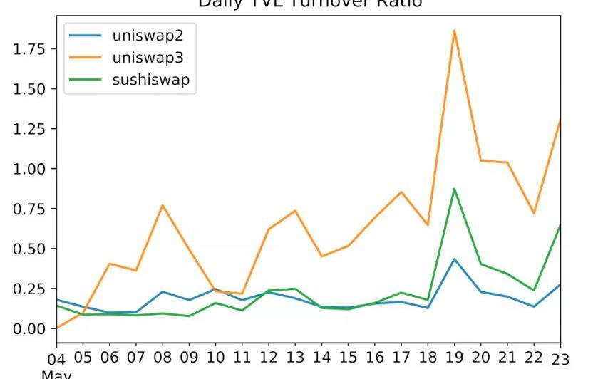 「資本效率高確實是v3的一個特點。」區塊鏈投資機構IOSG的分析也得出這樣的結論。該機構研究者跟蹤觀察了Uniswapv3的每日TVL周轉率,并將其與v2和Sushiswap進行比較后發現,v3的TVL周轉速度更快,「比如高峰期5月19日的市場崩潰,給v3提供1美元TVL,能轉化為超過1.7美元的交易量……相同情況下,v2只產生約0.2美元的交易量。」