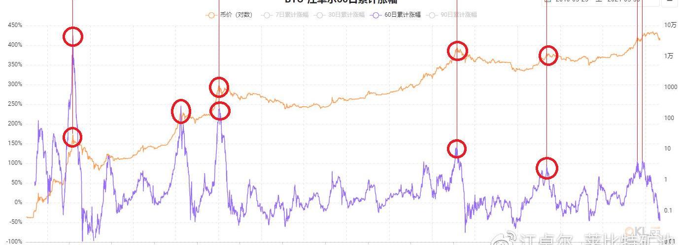 既然不再有完全復制的歷史經驗,那還有什么東西是永恒不變的呢?只有數學規律。數學規律需要的前提假設很少,例如60日累計漲幅,只假設比特幣的牛市,是由于大量新人新資金加入導致。