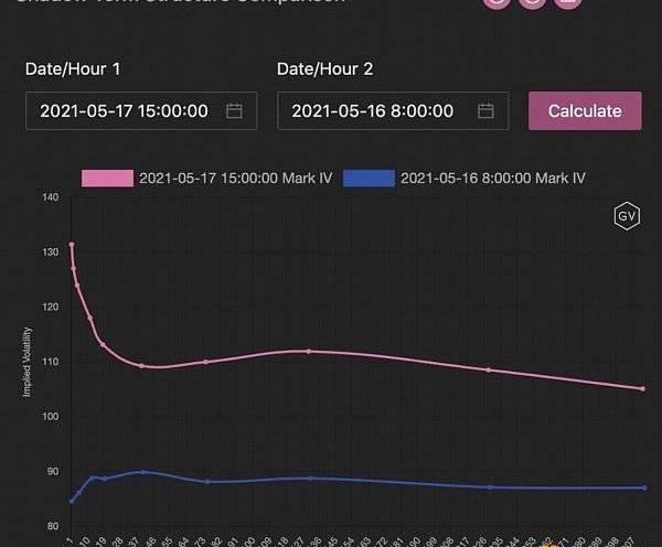 上圖為G-Vol.io期權分析工具提供的數據,圖中顯示5月19日與5月17日的長期期權波動率幾乎相同。