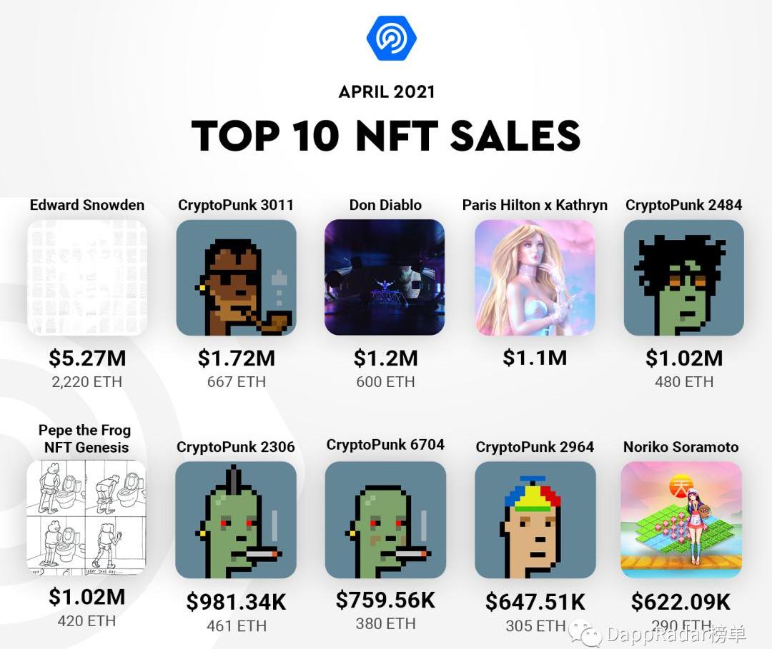 以太坊的NFT交易在4月份也面臨下降,這是由于OpenSea和Rarible的交易量略有下降。另一方面,加密朋克的交易量環比增長了19%。這一增長是由每個punk60萬美元到100萬美元不等的高銷售額推動的。在4月份NFT銷量前10名中,有5款來自加密朋克。