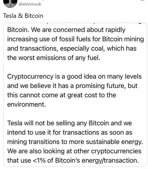 周三馬斯克稱,特斯拉不會出售任何比特幣,只要比特幣挖礦盡快過渡到使用其他可持續的能源,特斯拉就有意用比特幣做交易。特斯拉還尋求使用比比特幣能耗低的其他加密貨幣。