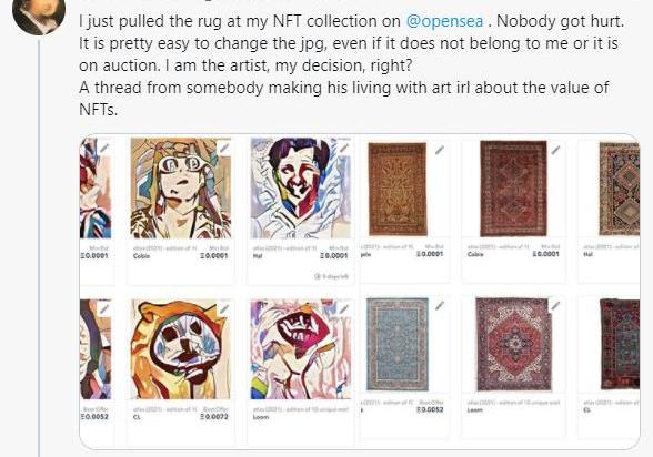 海外的一位加密藝術家、NFT用戶@Neitherconfirm曾表示,進入到opensea之后,即使該JPG在拍賣狀態或者該JPG本不屬于他,但用戶仍可以去改變這張圖。
