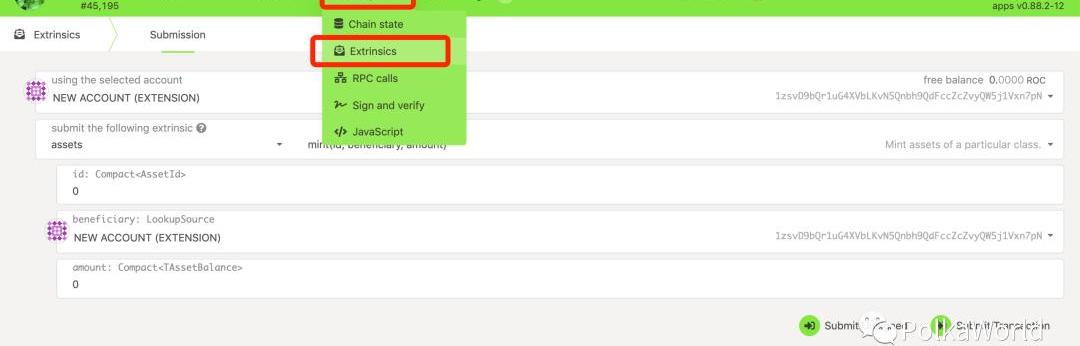 第三步:選擇developer選項中的Extrinsics,再選擇assets和mint(id,beneficiary,amount),再填寫你的資產ID和發行數量就可以啦!