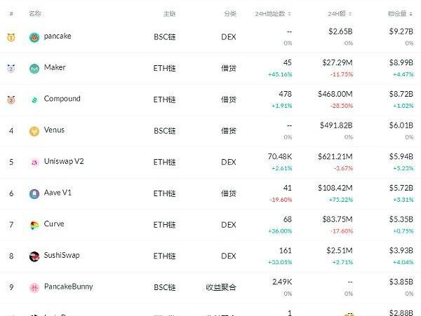 DeFi項目鎖定資產前十排名及鎖倉量,數據來源:Debank