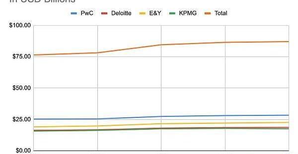 我看了一下安永、普華永道、畢馬威、德勤這四大事務所從審計和會計服務中賺取的費用。
