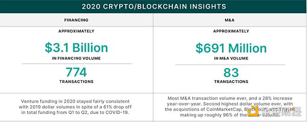 2020年,由于新冠疫情,就加密貨幣區塊鏈領域而言,第一季度至第二季度的融資總額下降了61%,盡管如此,該領域的風險融資與2019年美元交易量大致一樣。