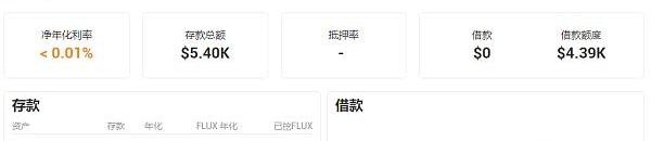 完成借款后可以在“我的數據”看到存款BETH數量為3,目前已挖FLUX數量為0。