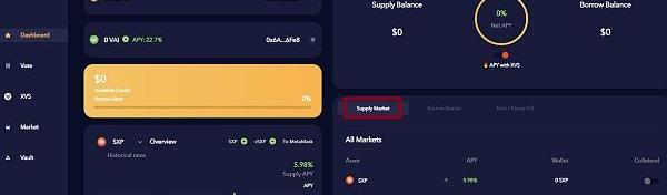 成功連接錢包后選擇Venus主頁點擊左側“Dashboard儀表盤”,找到“存款市場SupplyMarket”中存款幣種點擊USDT條目;