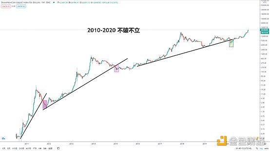 第二次不破不立則出現在2014年12月份,周線同樣跌破上行趨勢線,價格從跌破點355美元一路下殺至160美元低點,區間跌幅高達55%,而后價格金針探底回升,同樣不到兩個月的時間,價格便收回至300美元上方,接著便進入箱體區間震蕩行情持續筑底,后面便迎來了2016-2017年的牛市行情,而此次的不破不立的低點160美元也成為BTC這一輪牛市行情起漲的最低點,直至2013年見頂19800美元,兩年多的時間最大漲幅高達123倍。