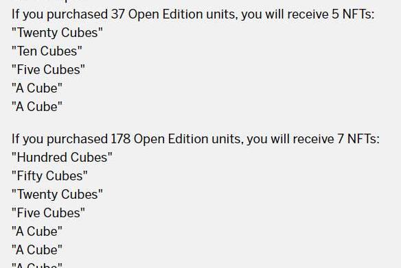 3.最終某一藏家獲得的NFT數量以及類型由不同的“Cube面值檔位”決定,官網舉了兩個例子: