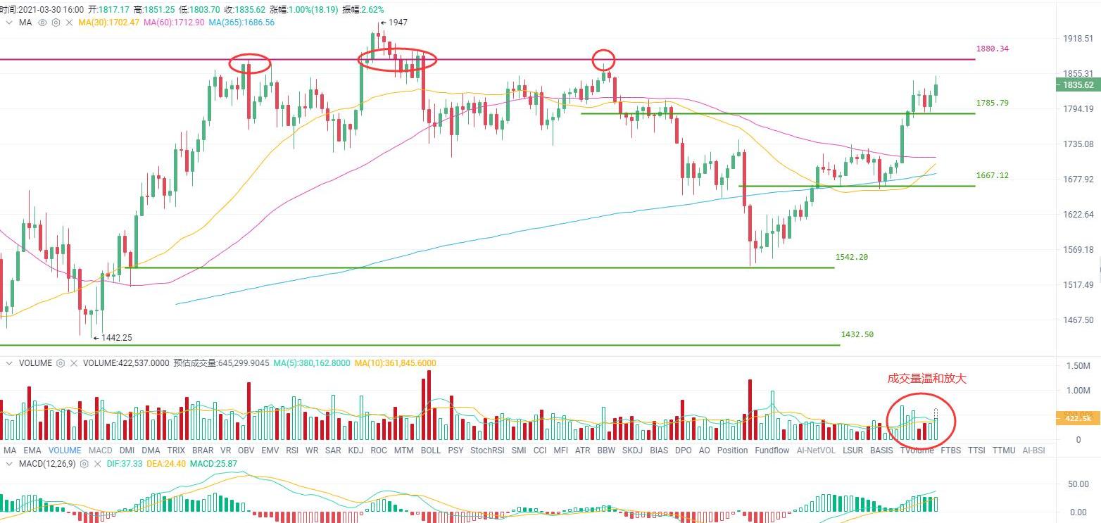 從盤面可以看出,ETH從昨天開始至目前的上漲勢頭強于比特幣,自昨日低點以來的最大漲幅已經超過10%。從成交量來看,本輪反彈同樣伴隨著成交量的溫和放大,同時動能指標MACD綠色能量柱也尚未出現明顯減弱。目前幣價正在逼近3月10、14、20這三天的高點或密集成交區域。