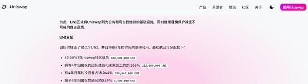 Uniswap官方數據顯示,UNI總量10億枚,60%分給社區;團隊成員和未來員工擁有約21.266%的份額,分4年解鎖;早期風險投資人和顧問分別有18.044%和0.69%的份額,同樣分4年解鎖。