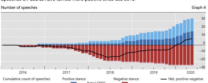 到2019年底,在公開場合中,央行官員相關的暗示變得頻繁,尤其是在零售型CBDC方面。自2018年底以來,提及有關零售型和批發型CBDC的演講次數再次增長,并且整體呈現比較積極的性質。