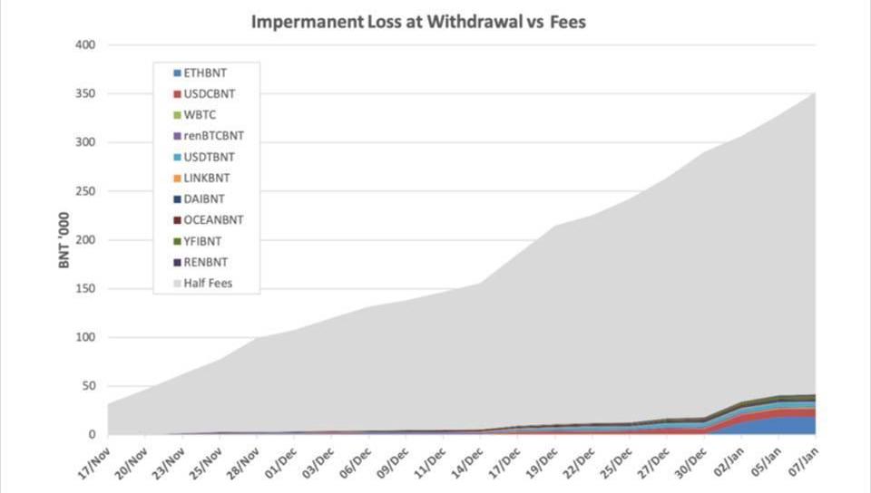 滿足上述條件,流動性提供者即可在撤出流動性時同時獲得Bancor的無常損失保險。而保險的費用則來自協議共同投資的手續費收益,但如果收益不足以100%償還流動性提供者的無常損失,協議就會增發BNT作為理賠金,這意味著,保險的成本將由所有BNT持有人共同攤薄。