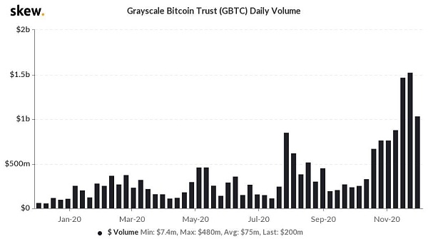 更大的機構購買壓力來自于灰度(Grayscale)的比特幣信托產品(GBTC),該信托為無法或不愿直接購買和持有比特幣的傳統機構和投資者提供了比特幣敞口。GBTC的性質是,當對產品的需求增加時,其份額價值相對于資產凈值的溢價就會增加。這導致做市商和加密貨幣本金通過購買現貨比特幣并將其貢獻給信托來套利溢價。鎖定期過后,若還有溢價的話,現貨供應商就可以兌現這些相對資產凈值的溢價。隨著GBTC相對資產凈值的溢價增加,那些希望抓住價差的人對現貨比特幣的買入需求也隨之增加。目前,灰度的萊特幣產品就是這個現象的一個極端例子。