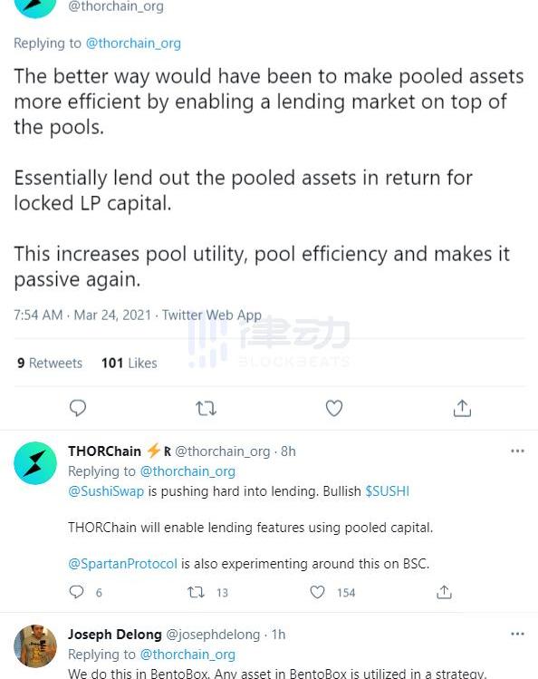 THORChain認為,雖然Uniswap想要提高資本效率,但簡單的X*Y=k是「真的」效率低下,v3現在想要激活LP,但這可能會影響操作不頻繁的LP,進而讓機器人卷土重來,「最好的方法是基于流動性池建一個貸款市場」。此外,它還提到,Sushiswap、SpartanProtocol都在進行類似的嘗試。
